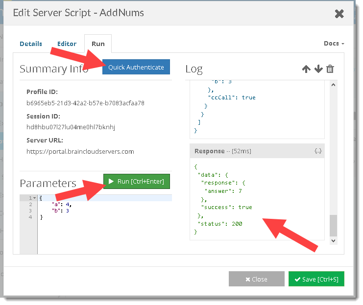 - The last tab is the Run tab. Here, you can do a [Quick Authenticate], and [Run] your new script to view the return!