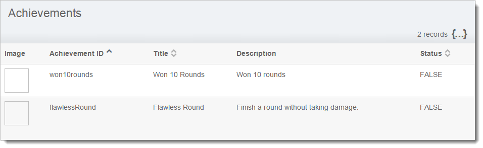The section is sortable by Achievement ID, Title, and Status. Status is TRUE if the User has earned the achievement, FALSE if not. Clicking the {...} button in the top right beside record count will display the raw JSON data for the Achievements listed on the page.