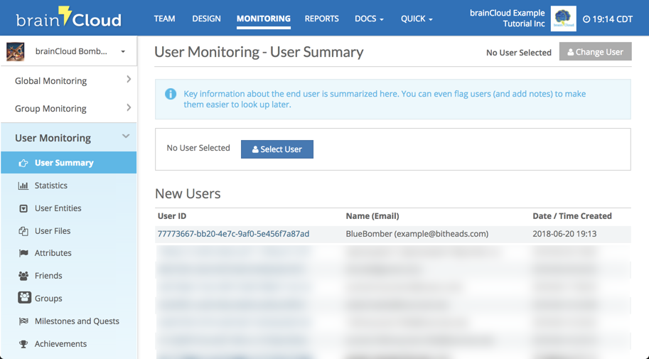 From here you will be in the User Summary tab of the User Monitoring section. If you haven't previously selected a user you will see the New Users page. You can now click the Select User button to open the Select User popup, or select a user from the list of New Users below.