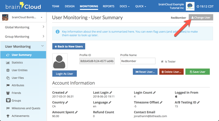From the results you can click on any of the returned players Profile IDs to view detailed information about them. You can switch Users at any time by clicking the Change User button at the top right of the page.