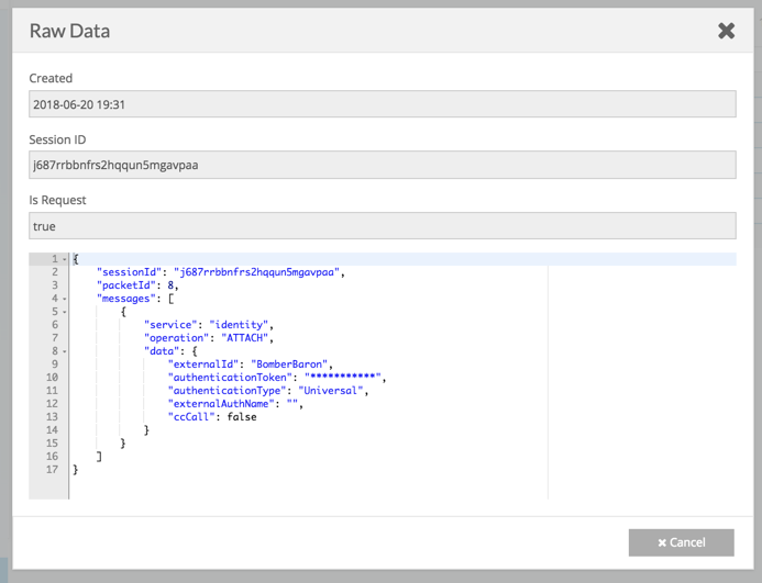 - Response - The response code issued by the server. Anything other than 200 indicates an error was returned. Like with the Packet ID, clicking the eye to the right of the response will open a window containing the raw data returned in the response.