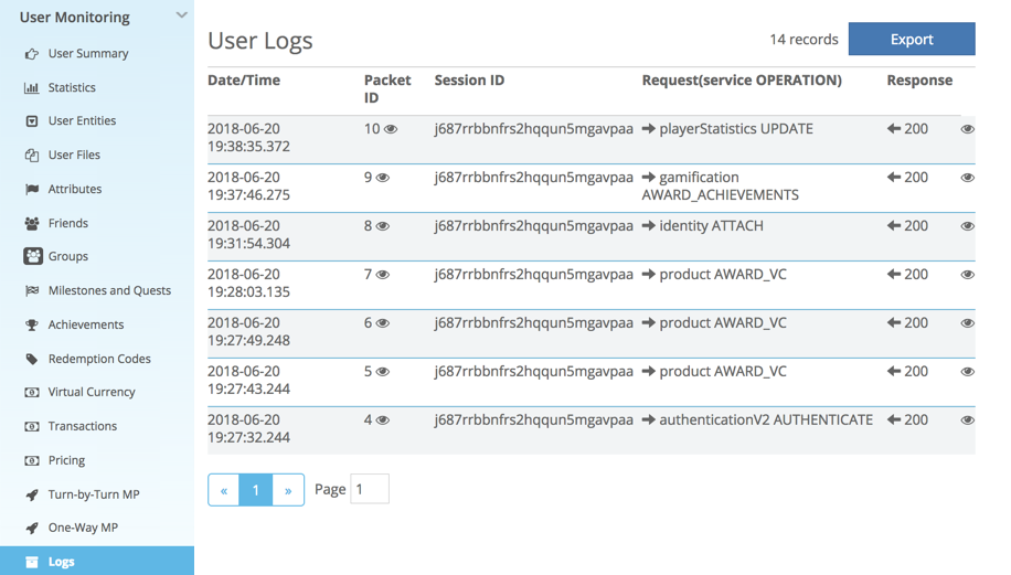 Another feature of the User Monitoring section is the ability to review the logs of an individual user. The logs contain any recent brainCloud requests and responses by the user. This is very useful for debugging during development.