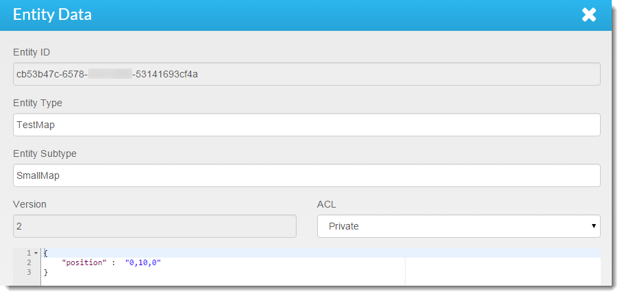 The Entity Data popup allows you to view and edit the entity's data. You can edit Entity Type, Entity Subtype, ACL, and the raw JSON data that makes up the entity.