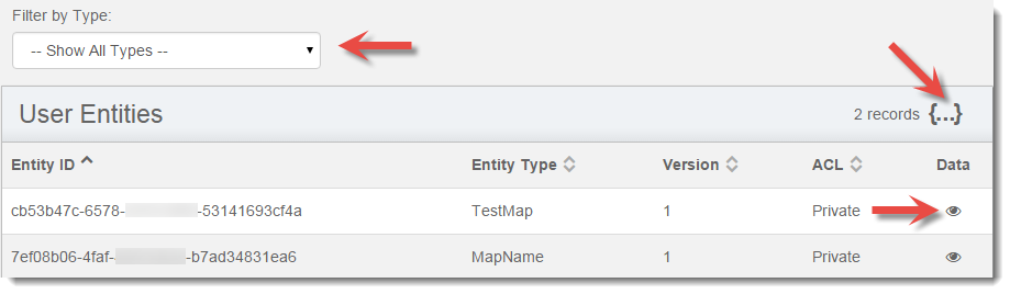 Entities can be filtered using the Filter by Type drop down list. The list can be sorted by Entity Id, Entity Type, Version, and ACL. To see the raw JSON for all the entities listed click the {...} icon beside the total record count at the top right. Clicking the eye icon to the right of an entity listing will open the Entity Data popup. From here you can view and edit the entity's data directly.